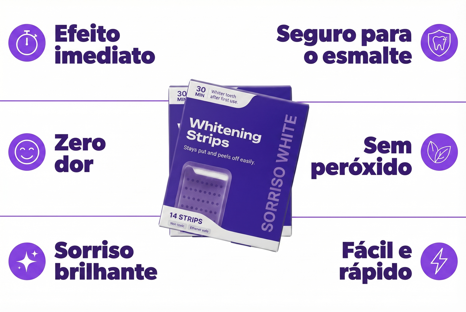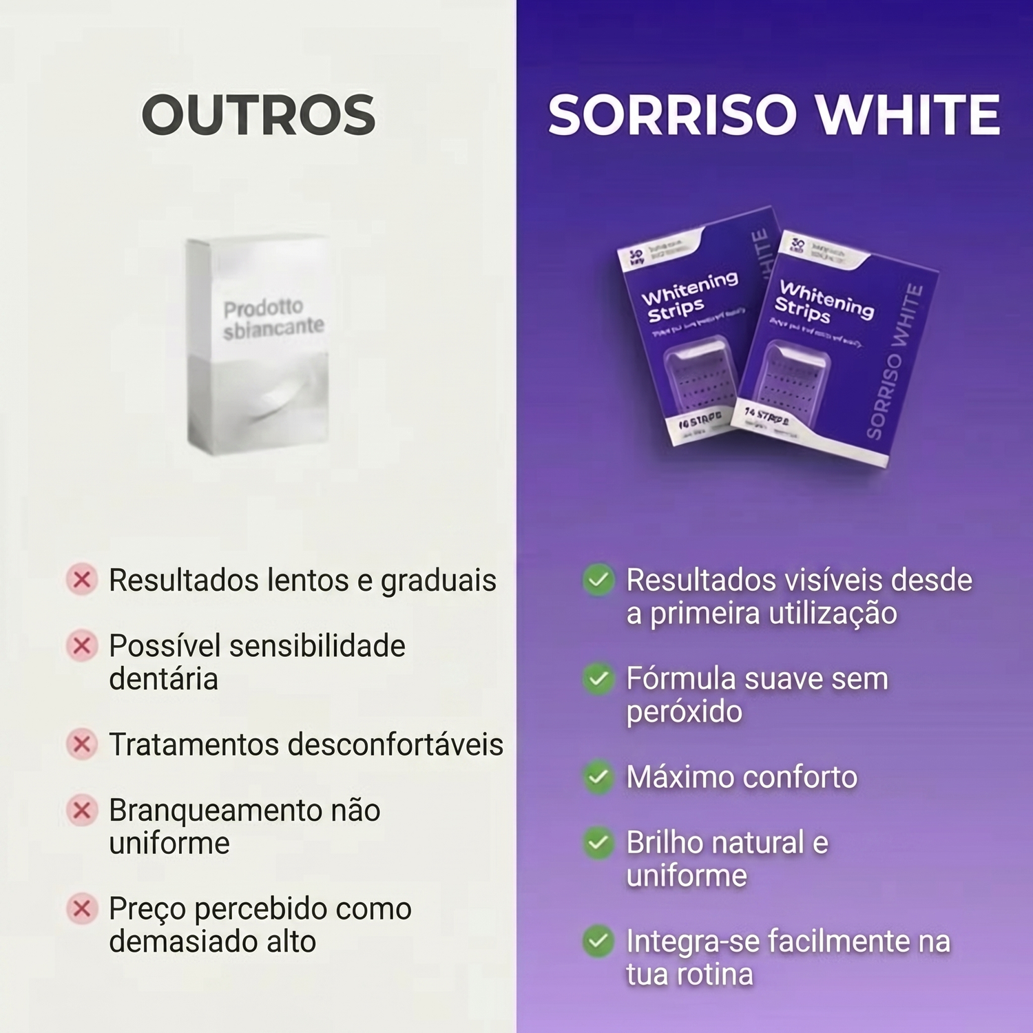 Descobre as tiras branqueadoras violetas SORRISO WHITE. Uma revolução imediata que oferece resultados visíveis no momento em que as retiras.