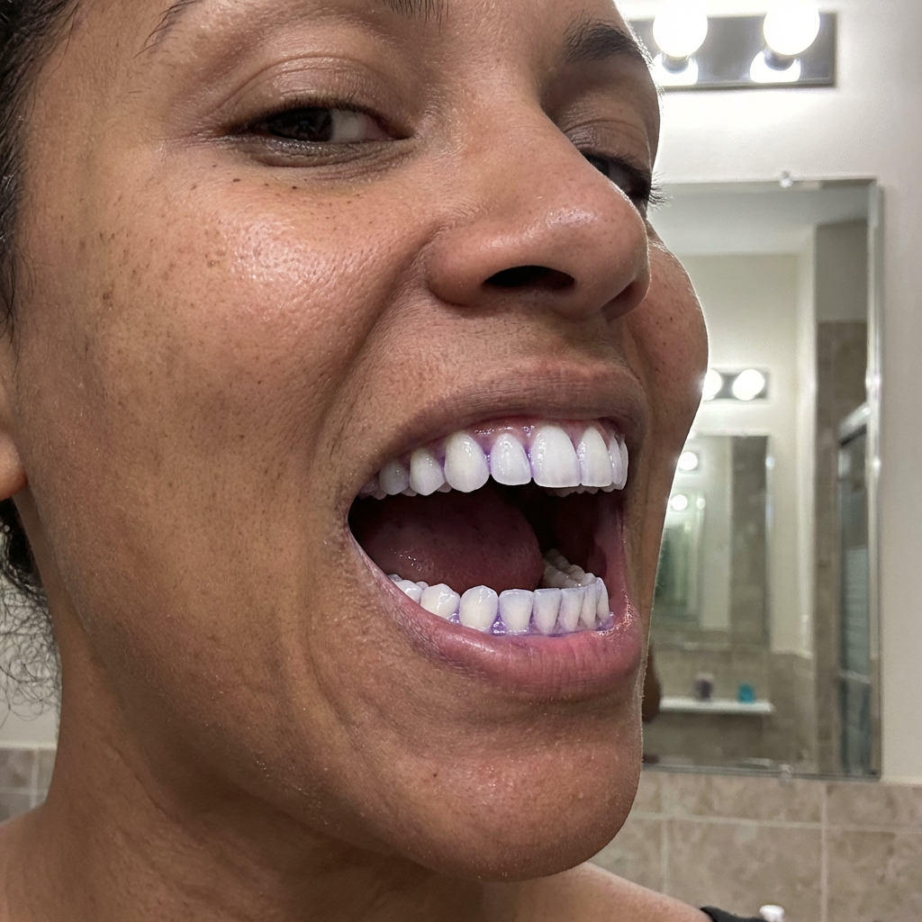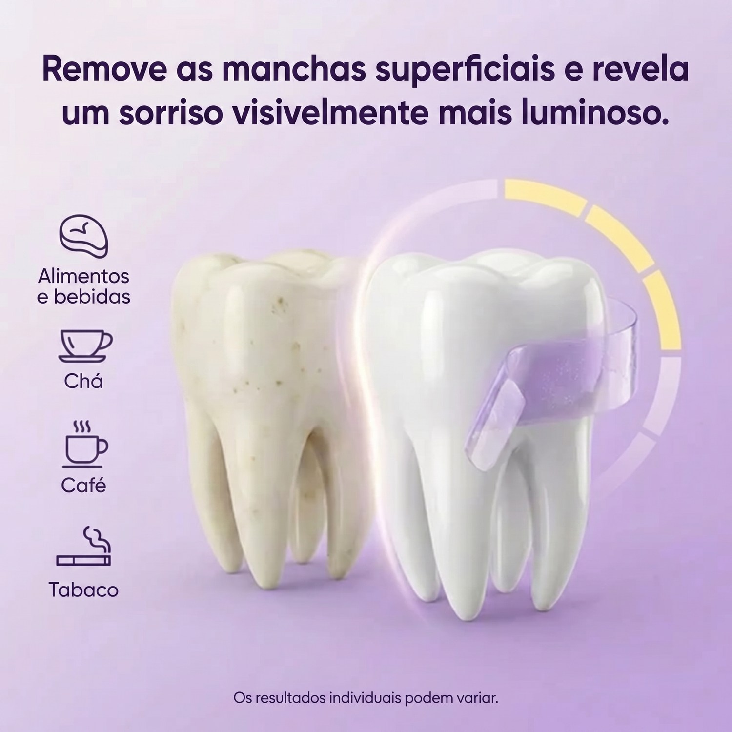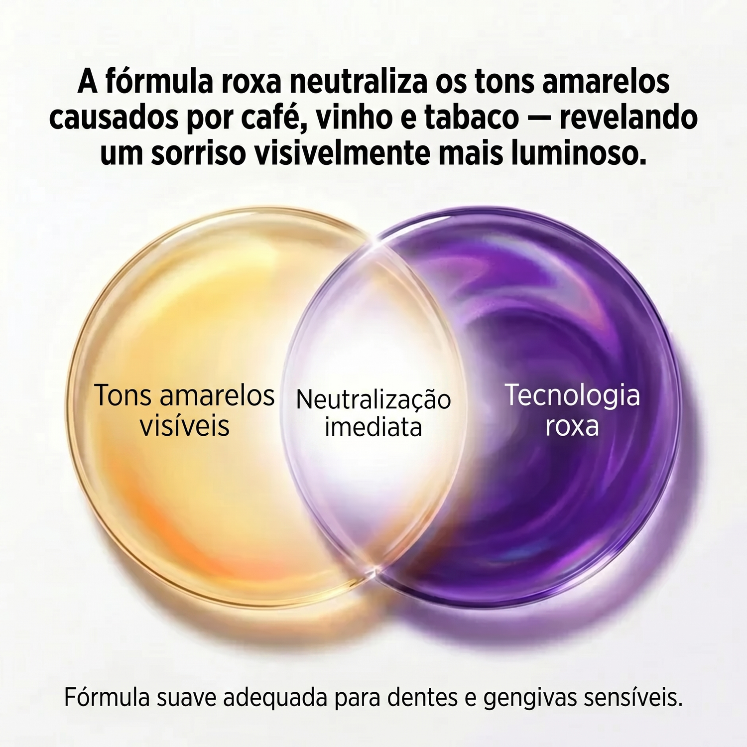A nossa tecnologia violeta corretiva neutraliza os tons amarelados ao contacto, para um sorriso imediatamente mais luminoso.